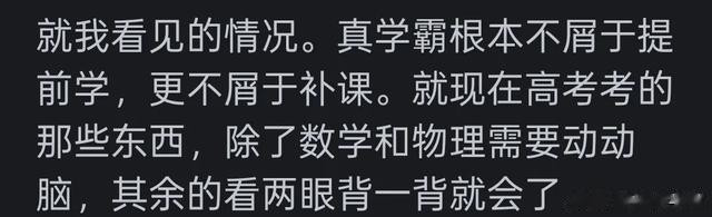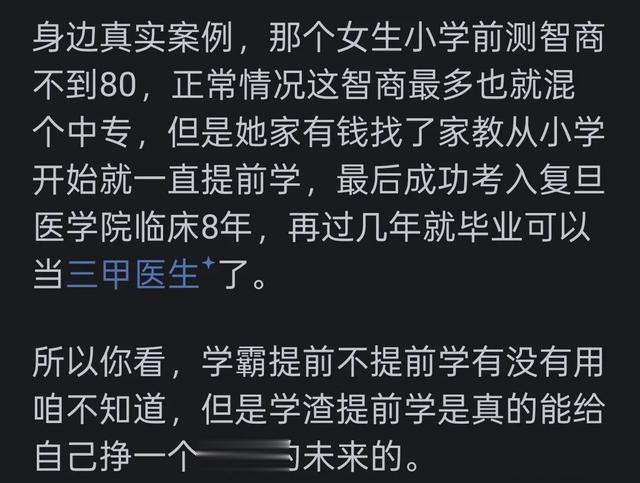 提前学习也要能有知识网络,才能将知识巩固。学霸肯定是提前学了,但是提前学的不一定能成为学霸。学霸是提前学吗?学霸是一听就会、高智商。我没有提前学过,没有上过课外辅导,只是完成作业该玩玩,该看电影看电影,该看剧看剧,不是学霸,但是很轻松双一流,所以相信真正学霸还是天赋加努力,天赋更重要吧。