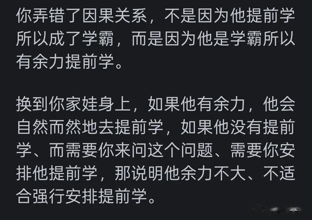 答案是对的。很多回答这个问题的家长,或者老师,自己作为学生的时候就很普通,现在反而高谈阔论。学霸的前提是聪明+自律,缺一不可。不聪明的再自律也提前学不了一点,别人一看就懂,普通资质的孩子可能要看半天。反之再聪明的孩子,心思不在学习上也没办法。所以你的答案是对的,先学有余力,用多出来的时间,要么巩固,要么提前学。